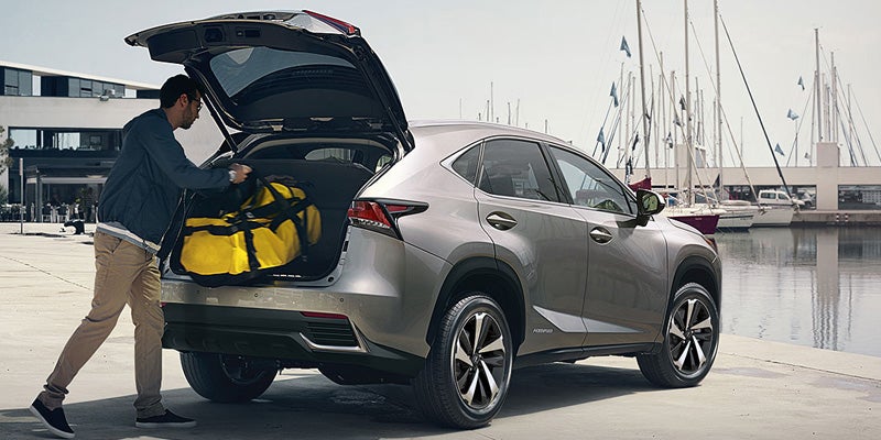 The 2020 Lexus NX 300h is available in a single trim level. The 300h rolls on 17-inch wheels, but 18-inch wheels are an option with the Premium package. Mud guards, roof rack cross bars, LED headlights, fog lights, and running lights add to the aggressive look. The Premium package adds in enhanced daytime running lights with integrated turn signals, while the Comfort package includes auto-dimming side mirrors. Keyless ignition and entry and power folding mirrors are available options. A power rear door with a kick sensor allows you access when your hands are full of groceries.