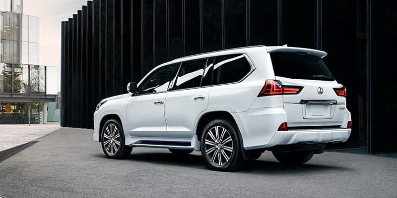 The 2021 Lexus LX 570 comes in the Two-Row, Three-Row, and the LX Inspiration Series. The Two-Row starts with 20-inch wheels, adaptive dampers, and an adjustable-height suspension. This trim also has fog lights, adaptive LED headlights, and a power liftgate along with power-adjustable and heated side mirrors, a Class 4 tow hitch, roof rails, and running boards. The Three-Row has the same basic equipment as the Two-Row, and both offer the Sport Package with black 21-inch wheels, body-color side mirrors with chrome accents, an updated sport grille, and front fascia, and a sport lower rear valence. The LX Inspiration Series comes with black exterior trim elements, a black chrome grille, and smoked headlights.